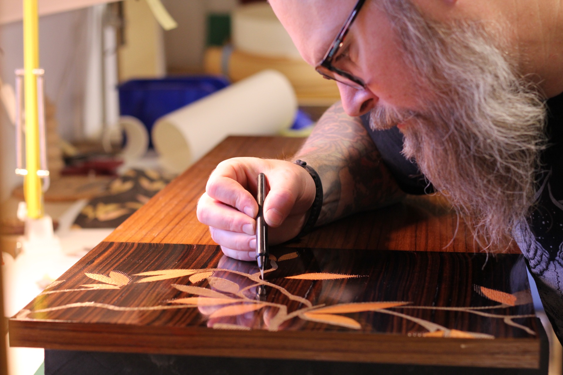 Vi har båda gesällbrev i dekopöryrket och har arbetat vid två av Storbritanniens främsta snickerier med intarsia. Med över 20 års erfarenhet av avancerade intarsiaarbeten har vi förfinat vår känsla för proportioner, färgspel och material. Varje projekt kräver ett lugnt handlag, noggrann planering och en konstnärlig blick för detaljer – från den första skissen till den sista poleringen av ytan.